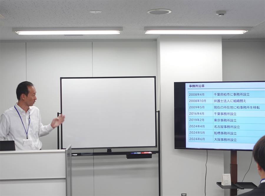 前ページでご紹介した「サマークラーク」を8・9月に開催いたしました。弁護士を目指し、当事務所に関心を持ってくださっている学生の皆様に、1回10名前後ご参加いただき、事務所見学やワークショップを行いました。今年は初めて船橋事務所でも開催し、千葉・船橋の2ヵ所で行いました。写真と併せてご紹介いたします。