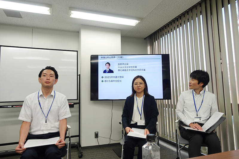 「なぜ都内ではなく千葉で働くのか」という質問は、毎年多くの方からいただきます。地域に根差した法律事務所ならではのやりがい、地域社会への貢献といった、ここでしか聞けない本音をお伝えする時間となりました。その他、司法試験の勉強法といった現実的な悩みにも、先輩たちが親身に答えていました。