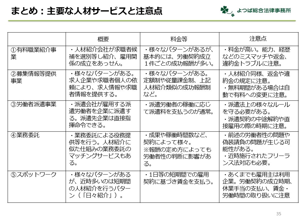 - 法的観点を踏まえた各種人材サービスの選び方のポイント