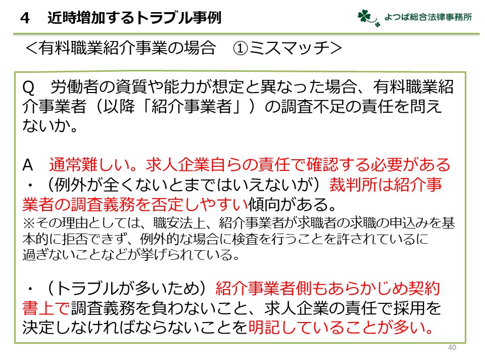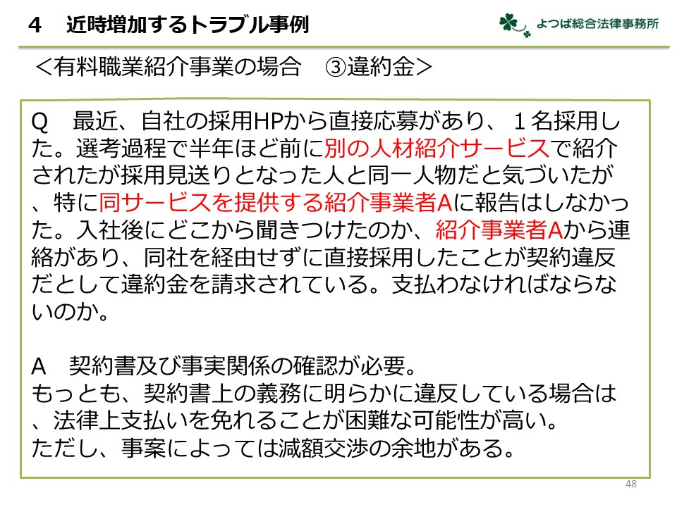 有料職業紹介、募集情報等提供事業、派遣について、よくあるトラブルをQ&A方式で解説しました。事例によっては直近の裁判例や実際の条文例、厚生労働省の注意喚起の内容なども交えて解説しました。