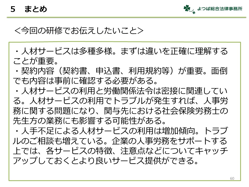 企業の人事労務をサポートする上では、各種人材サービスの法的な建付けや基本的な仕組みを理解したうえで、トラブルの予防・解決方法を把握しておくことが重要であることを解説しました。