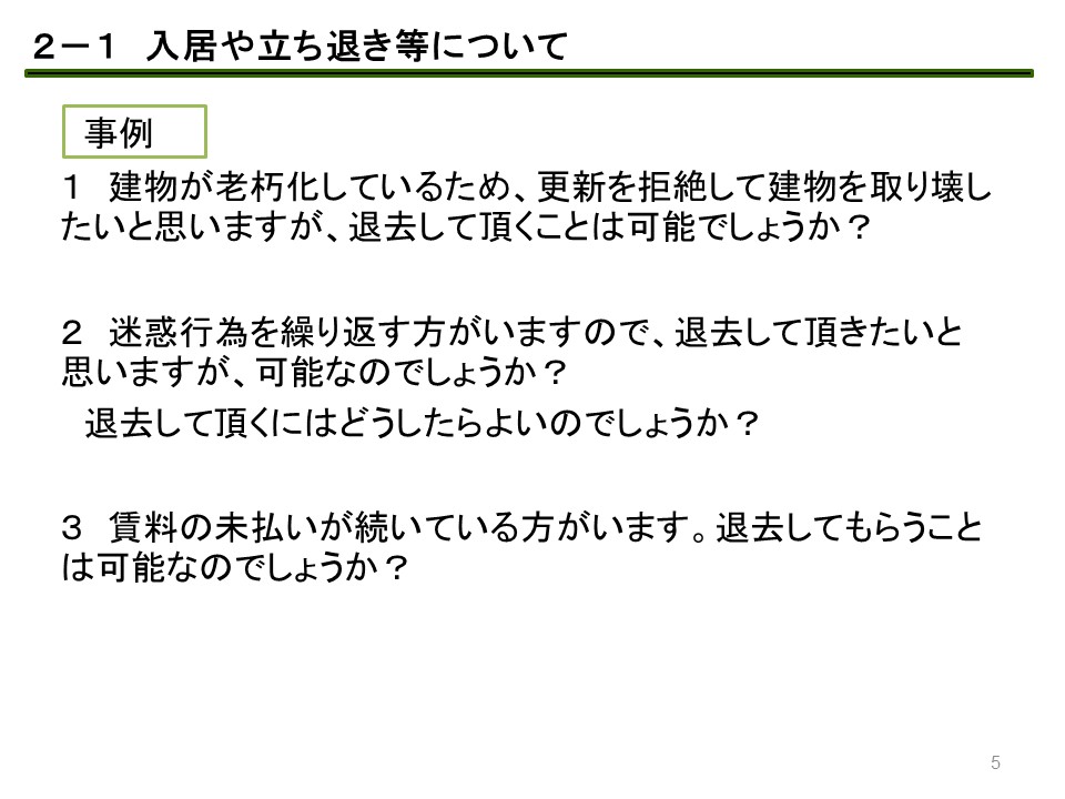 賃貸中の借主とのトラブルについて、次のような内容を解説しました。