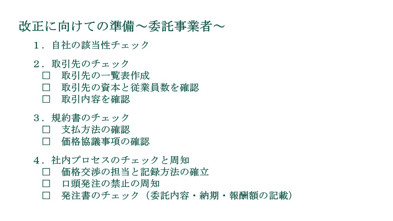 委託側、受託側の双方の立場から、改正に対応するためのチェックリストを公開し、そのポイントを解説しました。