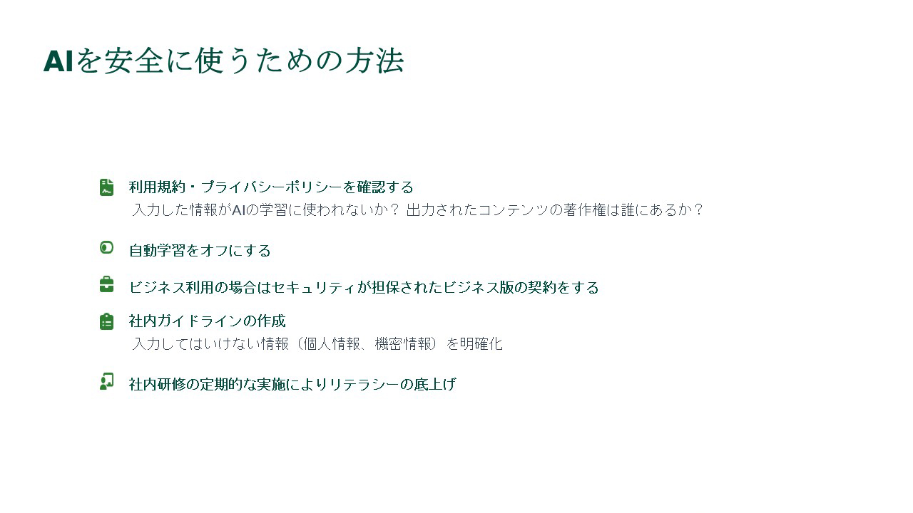 セミナーでは、社内におけるAI利用のリスクを減らすために最低限必要な対策等を解説しました。特に、社内での機密情報や個人情報の入力については注意が必要です。