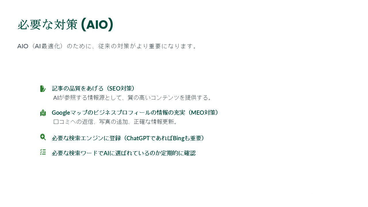 公式サイトの情報を充実させ、正確で質の高い情報を発信し続けること、そして口コミなどの客観的な評価を積み上げることなどの地道な信頼の蓄積が、AI時代におけるマーケティング対策(AIO)においても重要となります。